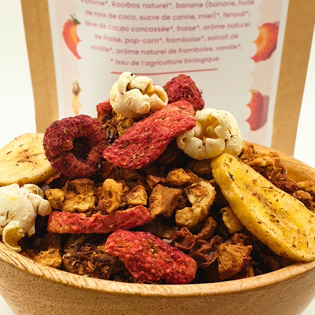 Pomme*, Rooibos naturel*, banane (banane, huile de noix de coco, sucre de canne, miel)*, fenouil*, fève de cacao concassée*, fraise*, arôme naturel de fraise, pop-corn*, framboise*, extrait de vanille*, arôme naturel de framboise, vanille*. *Issu de l‘agriculture biologique