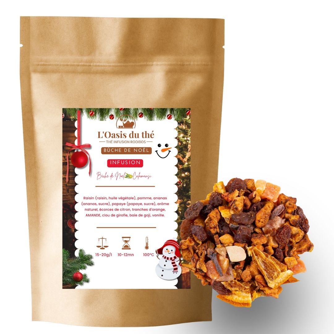 Retrouvez l’esprit du thé de Noël dans une tasse douce et festive : la rondeur d’une bûche vanille–amande, rehaussée par un éclat d’agrumes façon Calamansi (citron/mandarine) et un soupçon d’épices. Riche en fruits (raisin, pomme, ananas, papaye) et naturellement sans théine, cette infusion se savoure au coin du feu, après le repas… ou en carafe glacée pour les goûters en famille.
