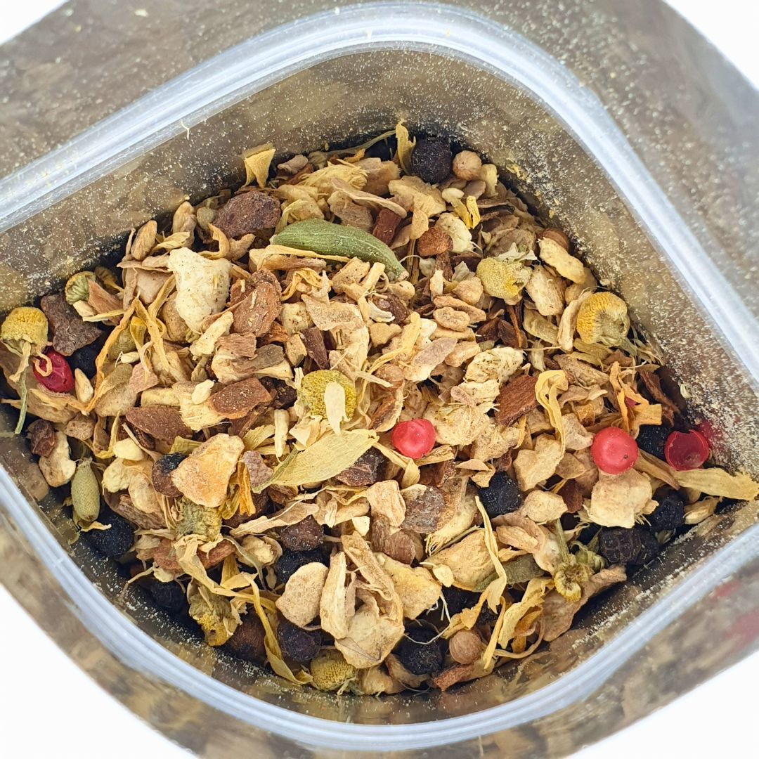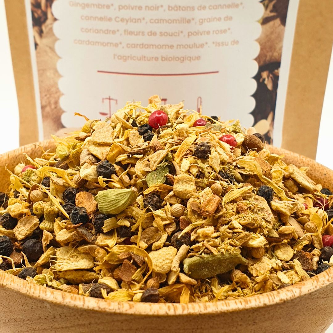 Gingembre vibrant • Cannelle douce (bâtons & Ceylan) • Cardamome parfumée • Pointes poivrées (noir & rose) • Floral discret (camomille, souci) • Finale ronde, chaleureuse.